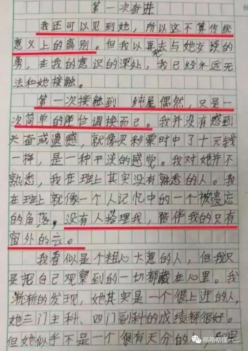 小学生还写了一篇作文叫《第一次奋进》,也是因为换座位的原因,小学生作文第一句话就表达了自己的情感。