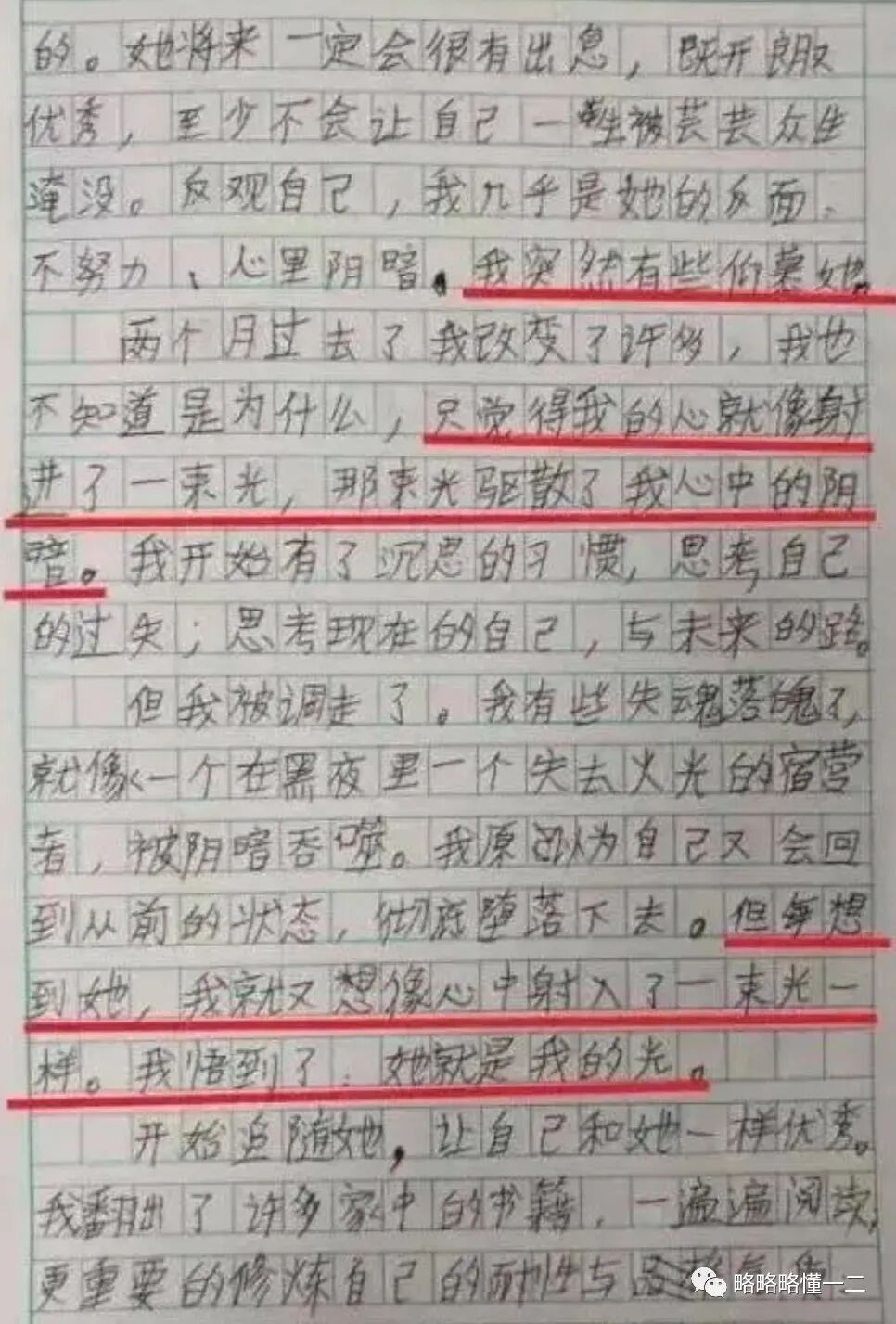 这篇作文简直就是大型表白“小作文”,还是把这份情感放心里,然后用“这束光”指引自己前进,和同桌一起努力。
