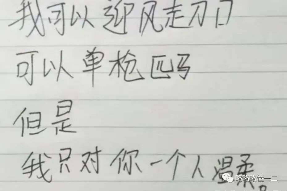 比如这封情书:“我可以迎风走刀口,可以单枪匹马,但是我只对你一个人温柔”,小学生说话一套一套,情书被老师“截胡”后,老师都得感慨,写情书方面的文笔比自己都强。