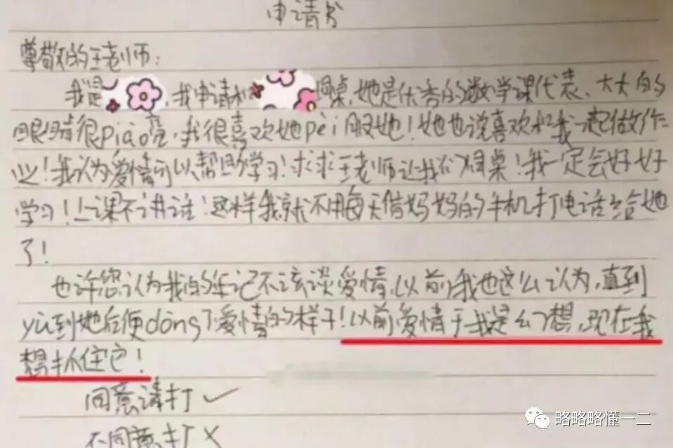 现在的孩子成熟都比较早,可能是受到了网络的影响,然后这些“小孩哥”还真的勇,为了“爱情”给老师写申请书要换同桌。