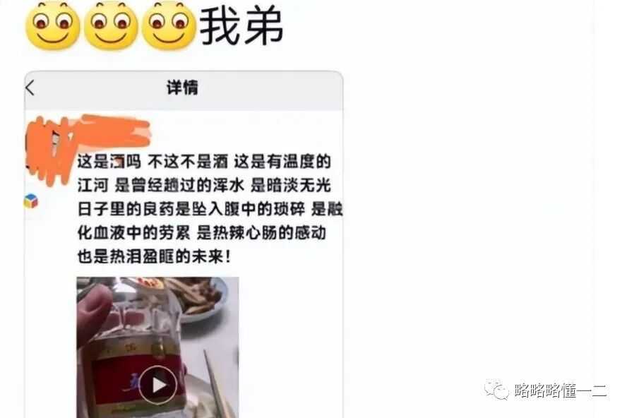 这位弟弟对“酒”的理解更像是大叔级别说出来的话,什么酒是有温度的江河,是曾经趟过的浑水,是热辣心肠的感动……不理解但大受震撼,可能是从哪里复制过来的。