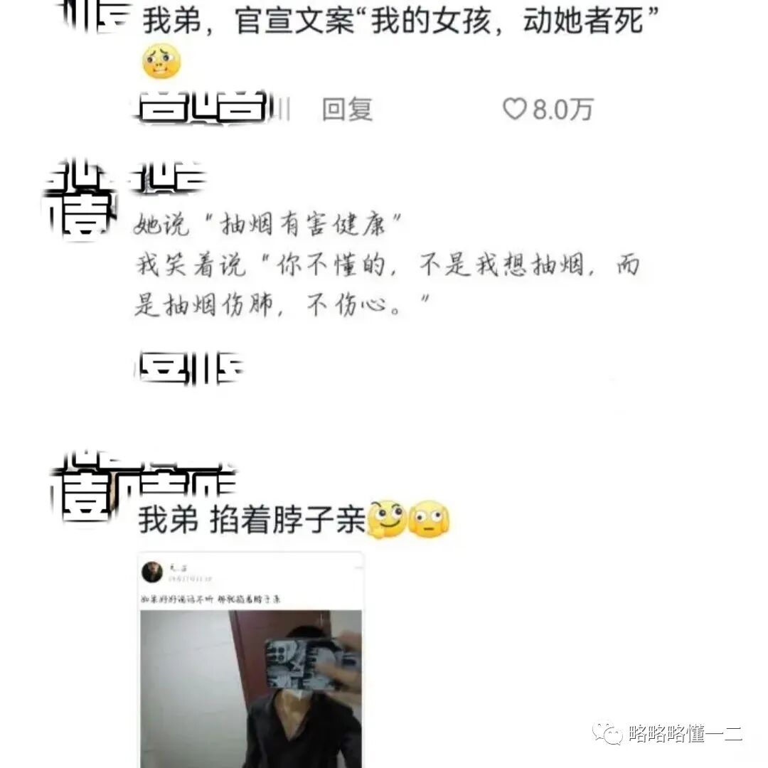 “我的女孩,动她者死”,还有弟弟会说:“如果好好说话不听,那就掐着脖子亲”,要是放在略略初高中的时候,一定觉得很霸气,那时候小说里也都这么写,但“掐着脖子”现在听起来好恐怖,窒息感扑面而来。