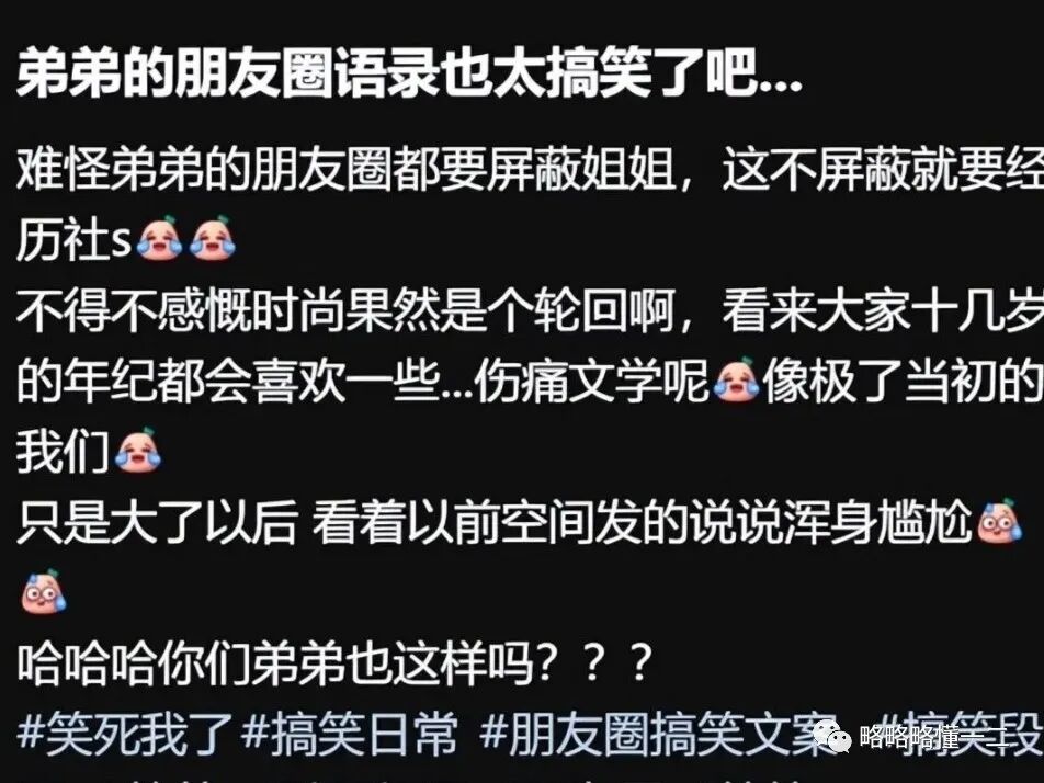 难怪现在的弟弟要朋友圈屏蔽姐姐,就弟弟这些“伤痛文学”的朋友圈,姐姐作为过来人真是一看一个不吱声,也太尴尬了。