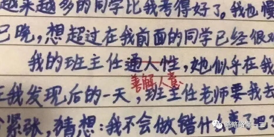小学生在自己的作文中写到“我的班主任通人性”,老师无奈把“通人性”改成“善解人意”,此时老师的内心应该是这个词用的挺好,下次别用了。