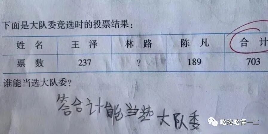 结果小学生回答“合计”能当大队委,这是把“合计”当成一个人了啊,那可真的是,想必题目中“林路”的票数怎么也没有“合计”多,小学生太有才了!