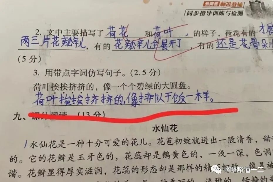 怎么来形容荷叶挨挨挤挤的呢?小学生的比喻简直太生动形象了,比喻成“像排队干饭一样”,确实有画面了。