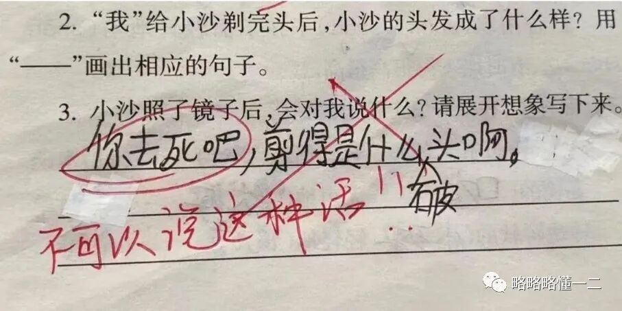 小学生的回答是不是每次“托尼老师”给自己剪完头发的心声啊?小学生在试卷上写着“你去死吧!剪得什么破头!”