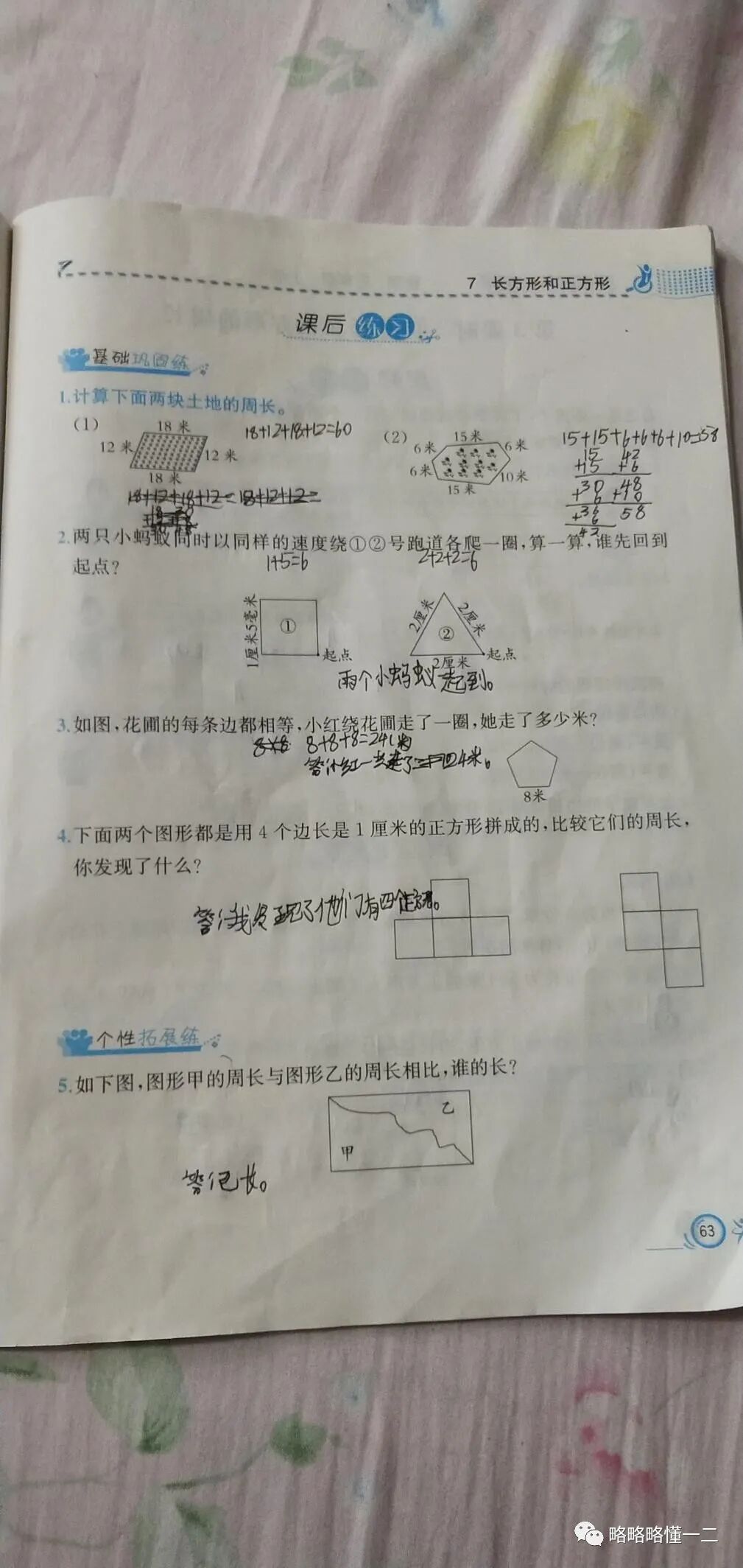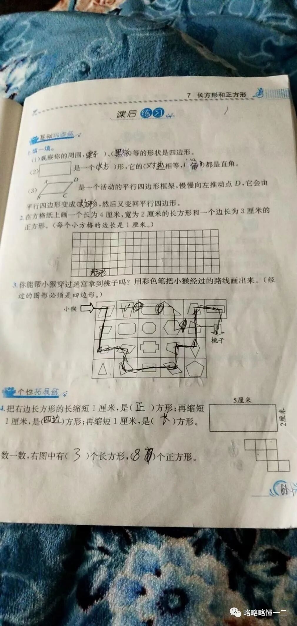 还有上面一道题,不得不说现在的小学生是真的会钻题目的空子,题目说这里有四个1cm的正方形,问你发现了什么,你发现了有四个正方形?