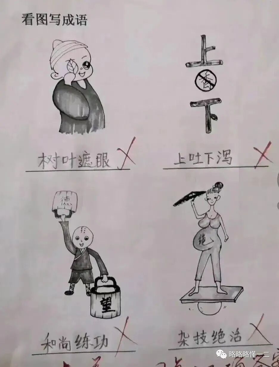 是让你猜成语不是让你看图说话呀,老师估计看到这个答案当时血压一定会很高吧。
