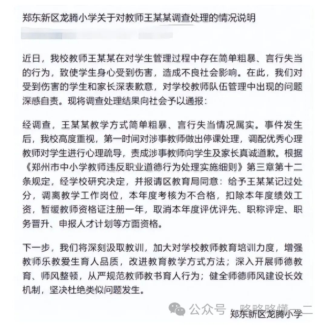 给出来的回复是把该老师调离教学岗位,停课记过,并且扣除绩效工资,取消评奖评优资格,教师资格证注册暂缓一年等。