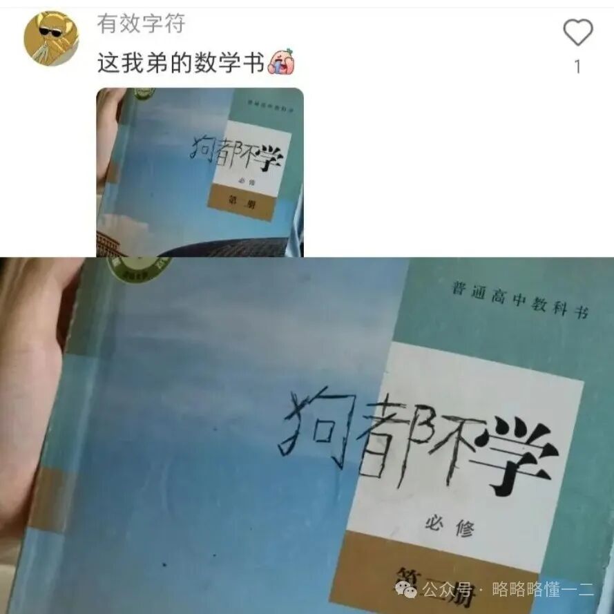 网友给大家展示了他弟的数学书,“数学”二字变成了“狗都不学”,看出来对数学学科的“怨恨”了,但又能怎么办呢?数学还是得学习的,数学稳稳占据主科地位。