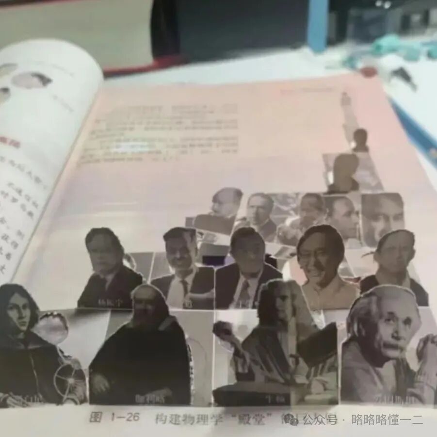 同学们是真的能“整活”,书上有一页插图标识是“构建物理学殿堂的巨人们”,不知道学生在哪里移植过来的人物头像,把这页变成立体的了,看起来还挺有质感。