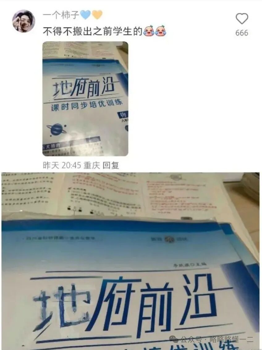 同学们“爆改”到一定程度后,连练习册都不放过了,除了改教材外,还有改练习册的,把“学府前沿”改成“地府前沿”的,看起来更恐怖了,和之前“爆改”成“活埋”的那名同学有的一拼。