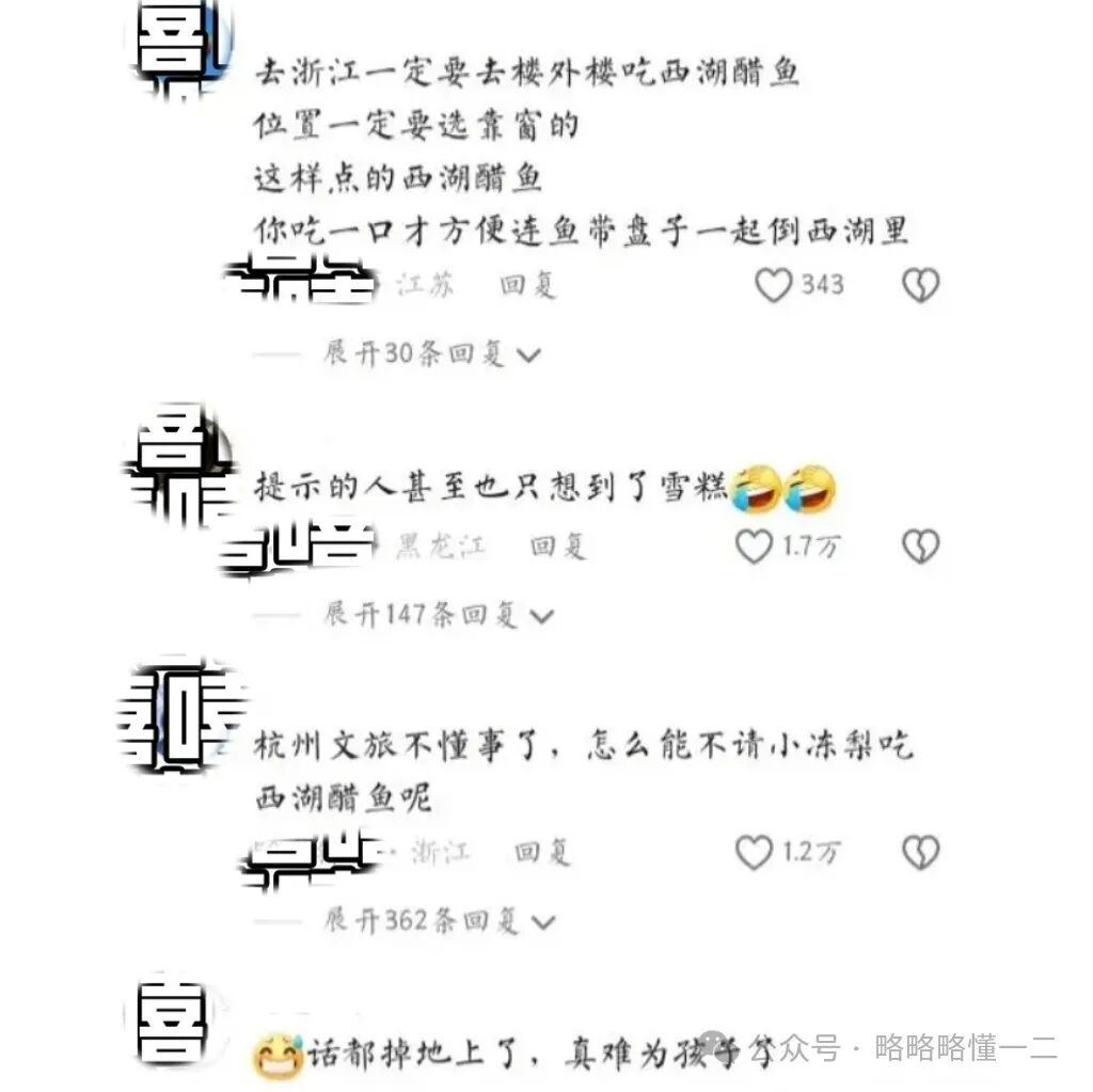 还有一部分网友一提杭州美食,就提那个西湖醋鱼,还说一定要选择靠窗户的位置,方便直接吃一口连盘子都扔进西湖里。