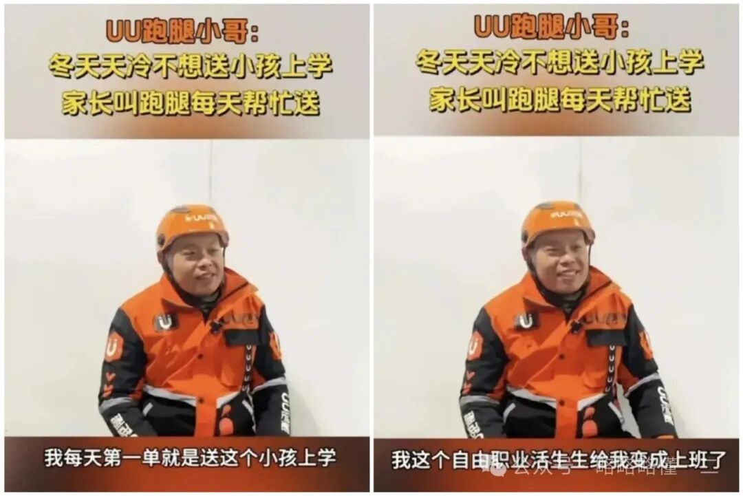毕竟孩子不放假,跑腿小哥的这项业务就得继续,跑腿小哥说自己每天的第一单就是送这个小孩上学,也算是给自己开个张了。