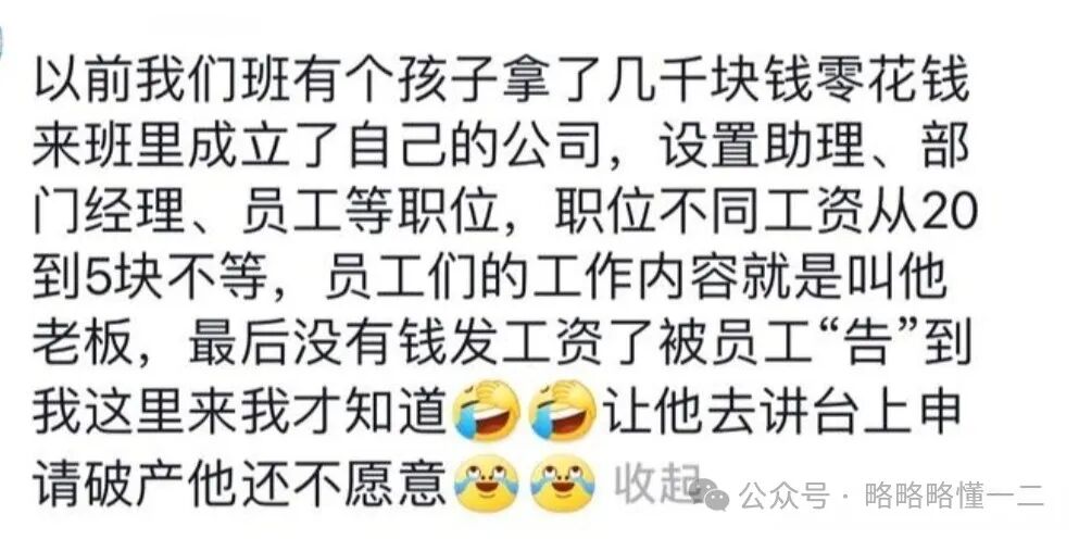老师让“老板”去讲台上申请破产,人家还不同意。真让人忍不住笑喷,想问问“老板”这种经营模式,家里的父母知道吗?