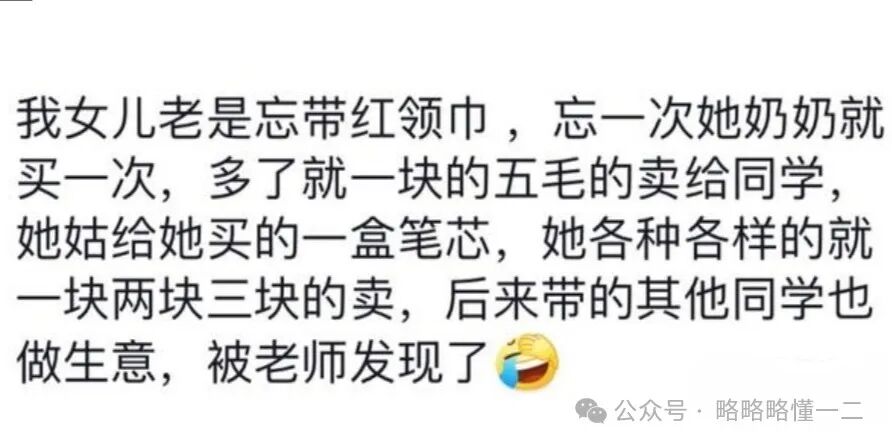 这名小学生总忘记带红领巾,奶奶就给她买,后来可能是红领巾太多了,于是就5毛1块地卖给同学了。