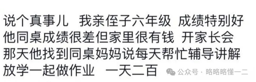 于是他灵机一动主动去找同桌的妈妈,毛遂自荐了,说可以帮助辅导同桌学习,放学后一起写作业,一天200块钱。