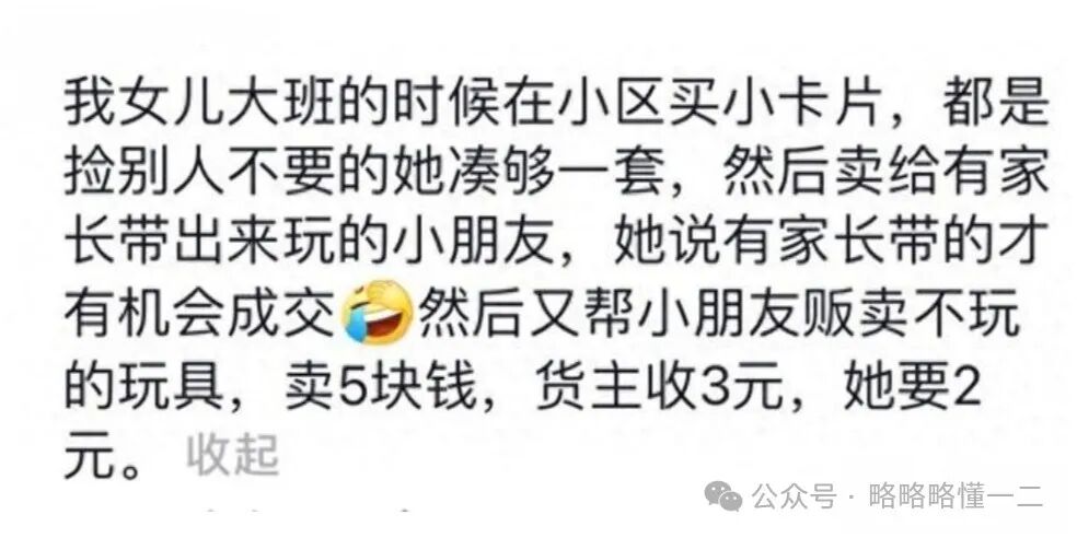 现在的孩子头脑灵活的很,让人意想不到。网友说女儿上大班的时候在小区门口卖小卡片,“进货”来源都是捡别人不要的卡片自己凑成一套,然后卖给其他小朋友。