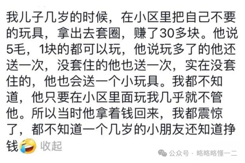 孩子有商业头脑是好事,可以不用怎么费力气就获得收入了,有时候像玩具套圈这样的活动,既可以赚钱,又帮助自己出闲置。