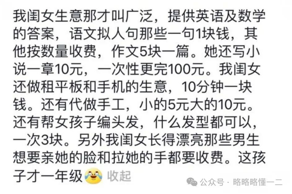 还有网友说她女儿生意非常广泛,提供作业答案,而且还分学科分任务量,加上出租平板和手机的生意,10分钟一块钱,这一块钱还不是轻轻松松就赚到手了。