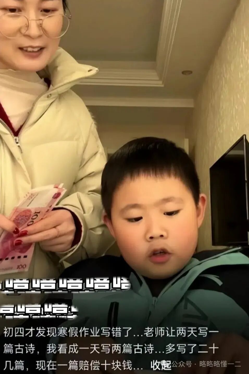 老师让小学生两天写一篇古诗,妈妈看错了让他一天写一篇古诗,多写了二十多篇,我们看到妈妈手里拿着现金,按照一篇古诗10块钱的价钱,正在补偿给小学生,让人笑不活了。