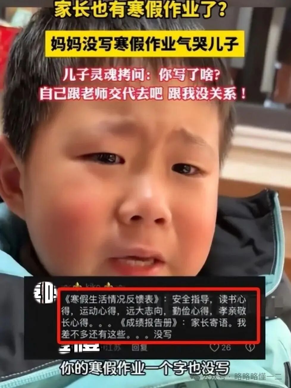 按理说小学生仅剩一篇作文就完成了寒假作业,是非常让人开心的事情,但他还没有来得及开心,就发现布置给妈妈的寒假作业一点没完成,直接把小学生气哭。