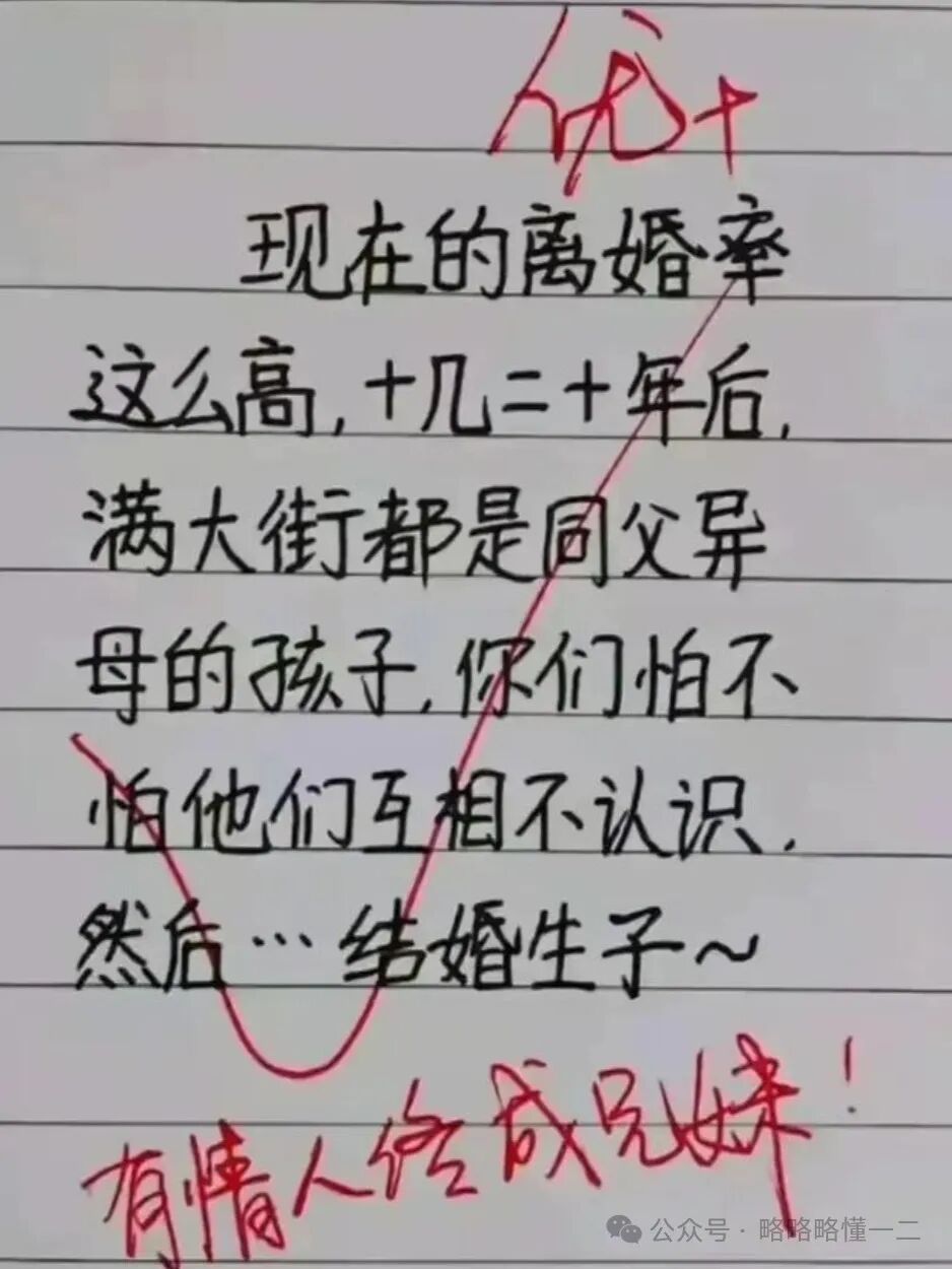 小学生这么一说还真有道理,那些离婚重组家庭的家长们真应该注意了,老师还在下面评论说:“有情人终成兄妹”。