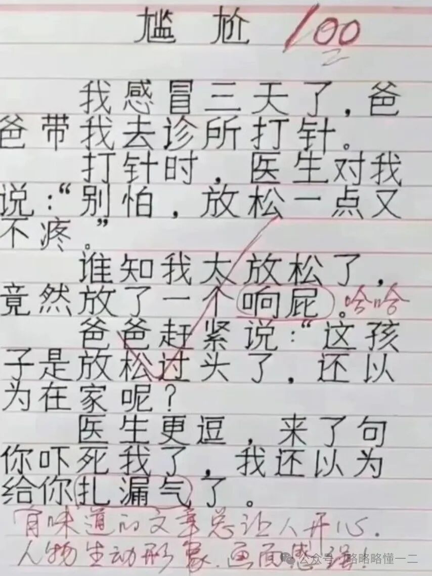 打针时医生让他放松一点,放松一点不疼,而小学生倒是很放松,甚至还放了个屁,爸爸尴尬解释说这是放松过头了。