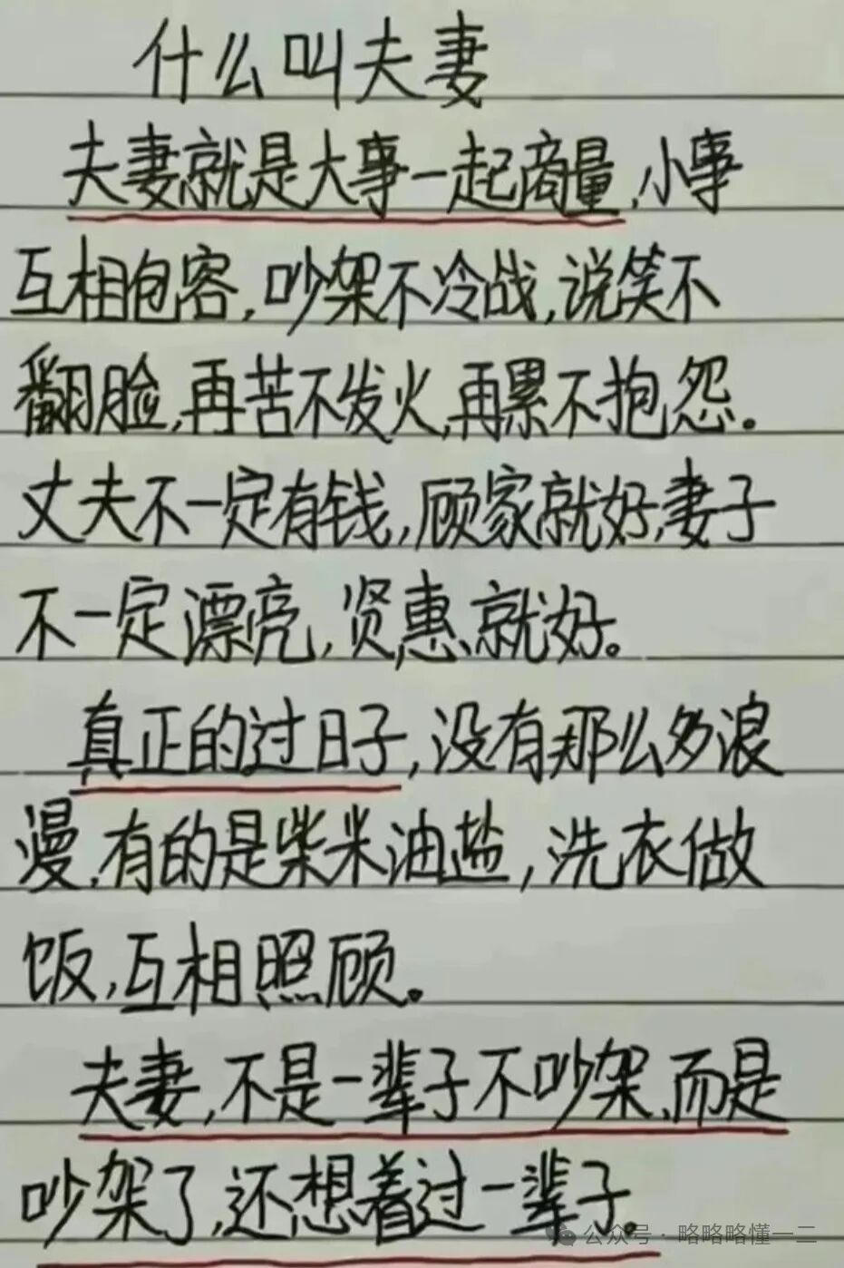 就比如小学生关于夫妻关系的论述,小学生说夫妻就是大事一起商量,丈夫不一定有钱顾家就好,妻子不一定漂亮贤惠就好。