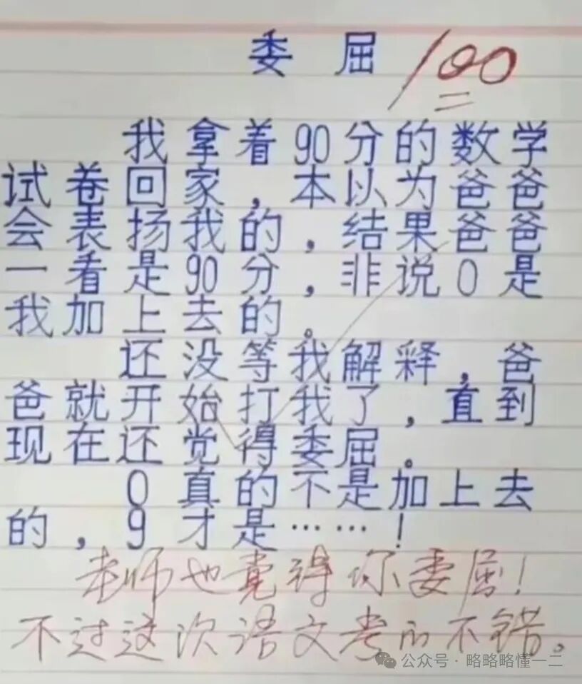 小学生说自己拿着90分的试卷回家给爸爸看,以为爸爸会表扬自己,结果爸爸一看数学90分,非说“0”是他后加上去的。