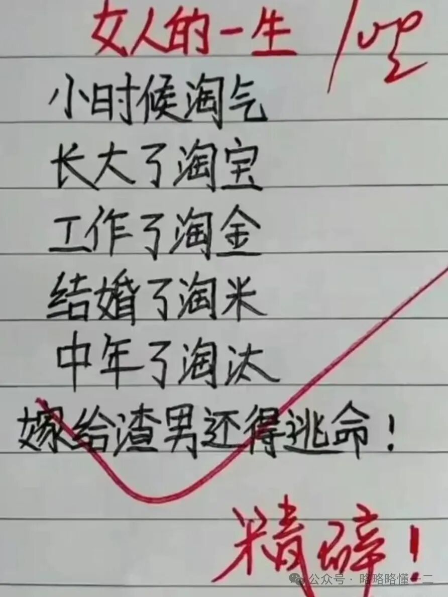 小学生写的《女人的一生》太真实了,小小年纪就看透了这个道理,说女人小时候淘气,长大了淘宝,工作了淘金,结婚了淘米,中年了淘汰,嫁给渣男还得逃命。