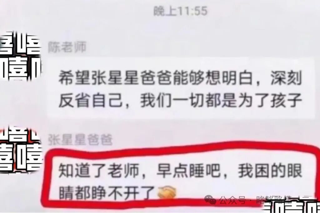 “张星星爸爸”和老师说话也很有意思,老师大半夜在群里还忙着教育孩子,希望家长能够明白,结果“张星星爸爸”真是藏不住一点啊!直接和老师说:“知道了老师,早点睡吧,我困得眼睛都睁不开了。”