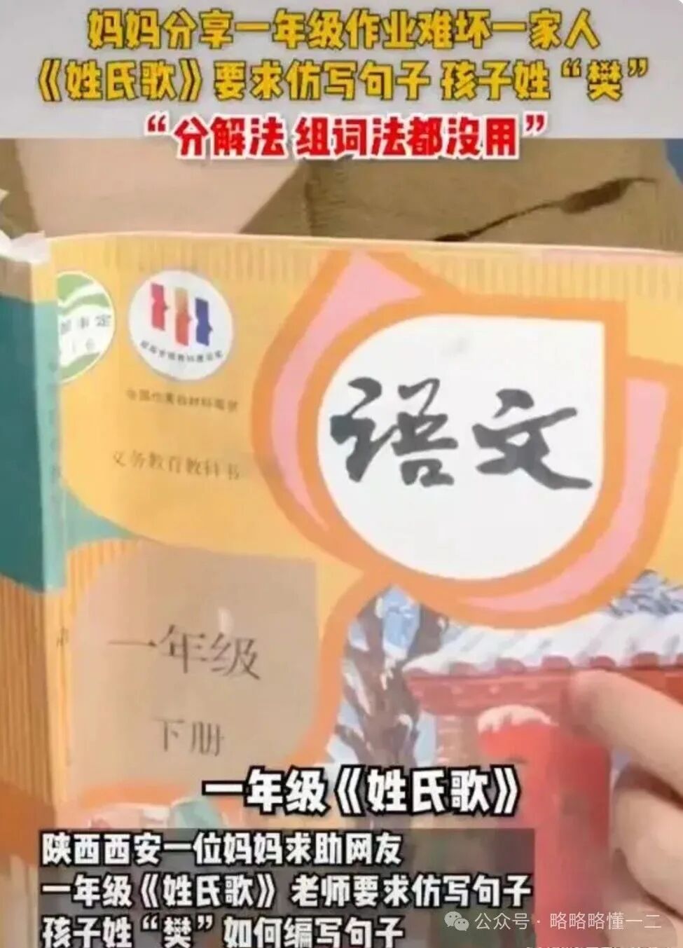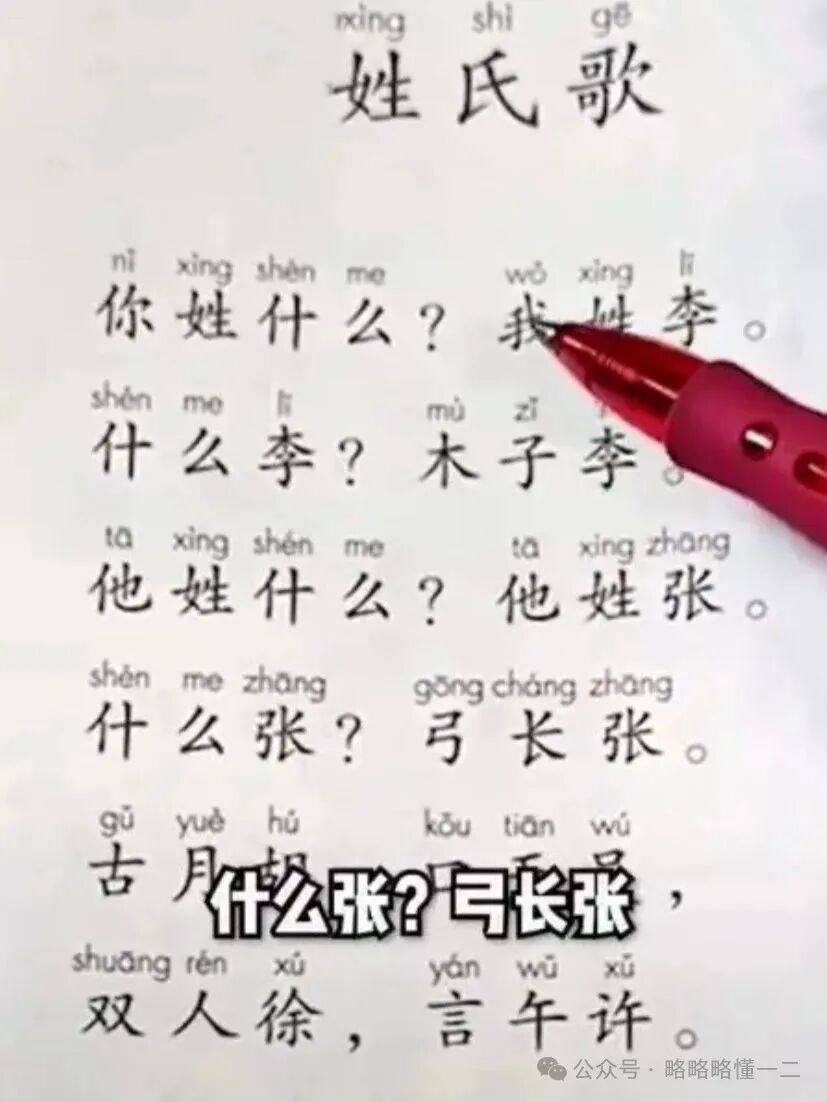 在一年级的语文书中有这样一课叫《姓氏歌》,主要是讲了把形式拆分开来,比如“木子李”、“弓长张”等。