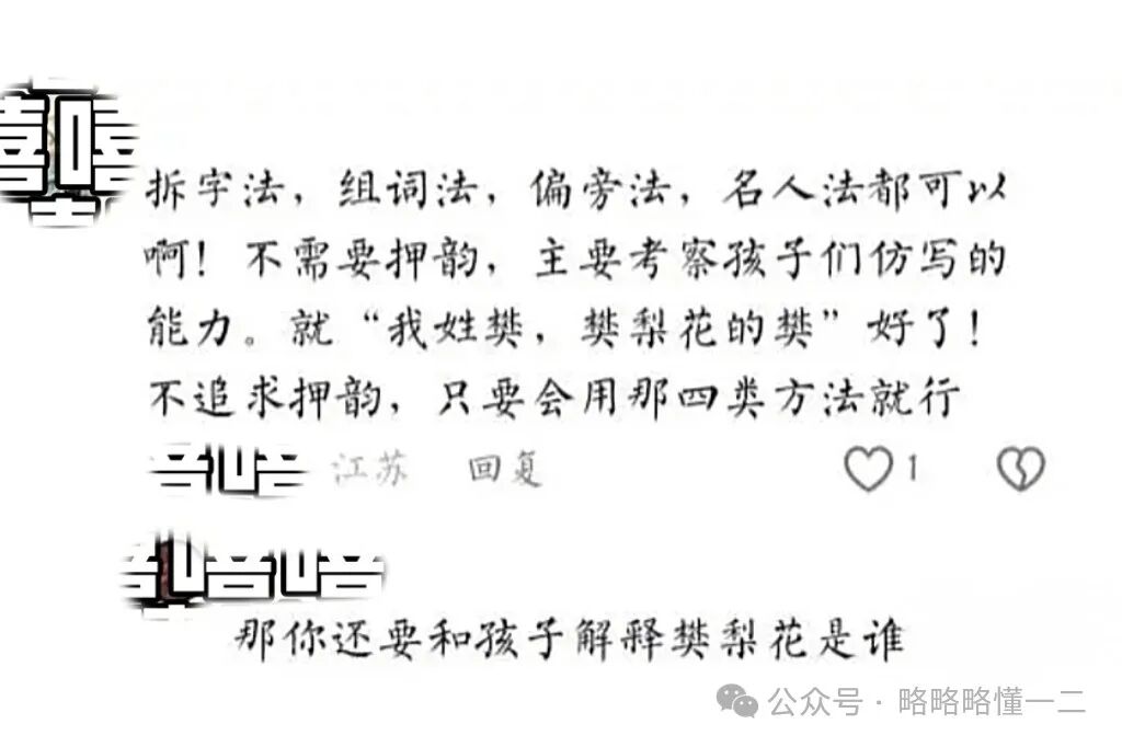 网友认为拆字法、组词法、偏旁法、名人法都可以,也不需要押韵,主要是让孩子学会仿写就可以了。
