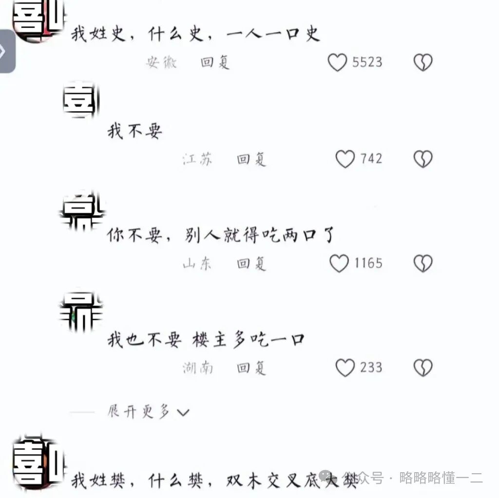 还有网友说着说着就画风突变,变得离谱起来,没有帮助解决姓“樊”怎么仿写,反而根据自己的姓氏仿写了,比如姓“史”的网友说:“我姓史,什么史,一人一口史”。