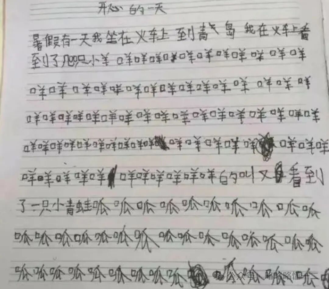 可接下来小学生写的内容让人看后笑不出来,写他在火车上看到了几只羊在咩咩咩(此处省略若干字)地叫,又看到了小青蛙呱呱呱(此处同样省略若干字)地叫。