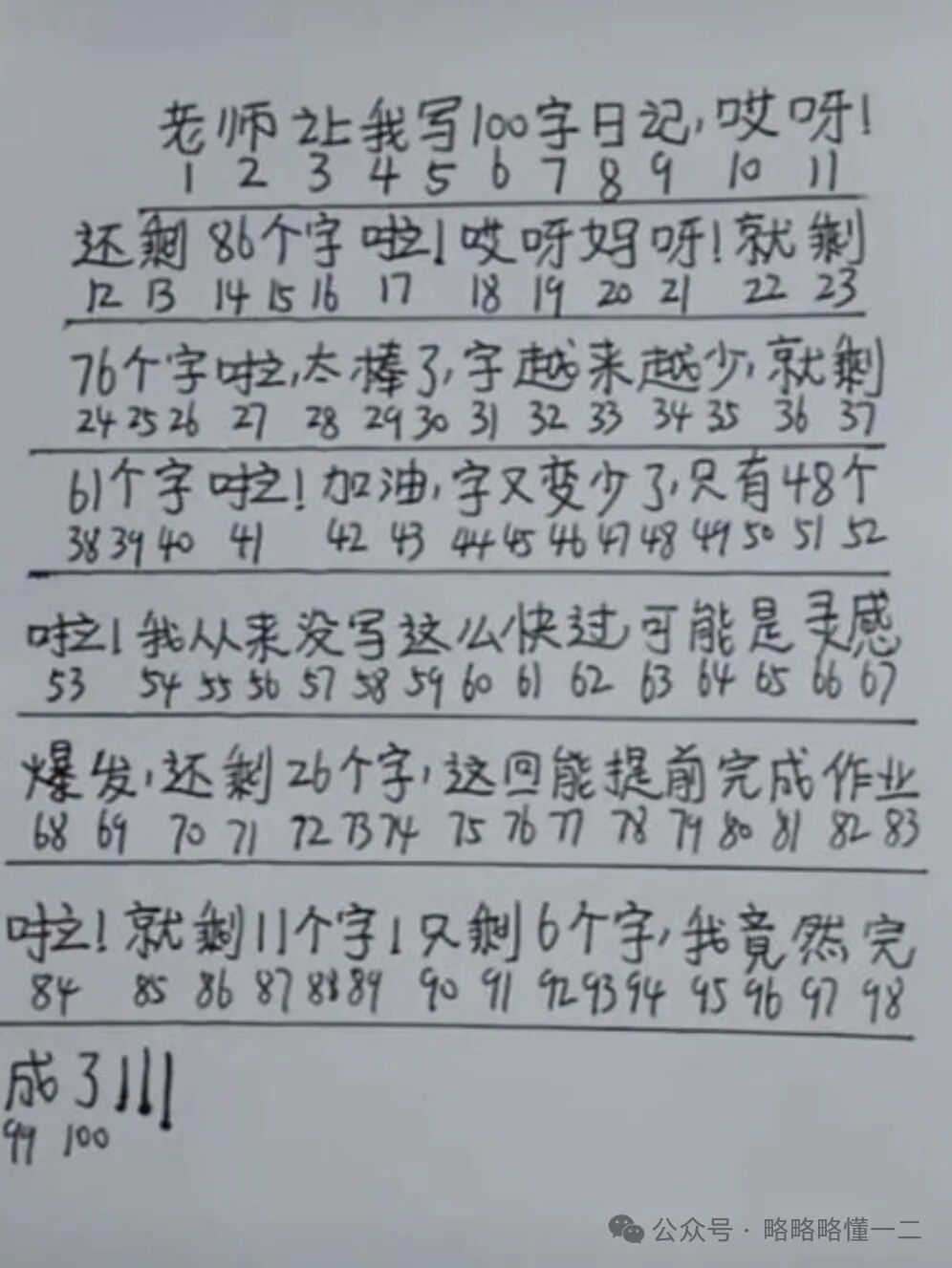 这名小学生更有意思,老师让写100字的日记,好像写多了自己会吃亏一样,居然每个字都标数了,正正好好写了100字,多一个字都没有。