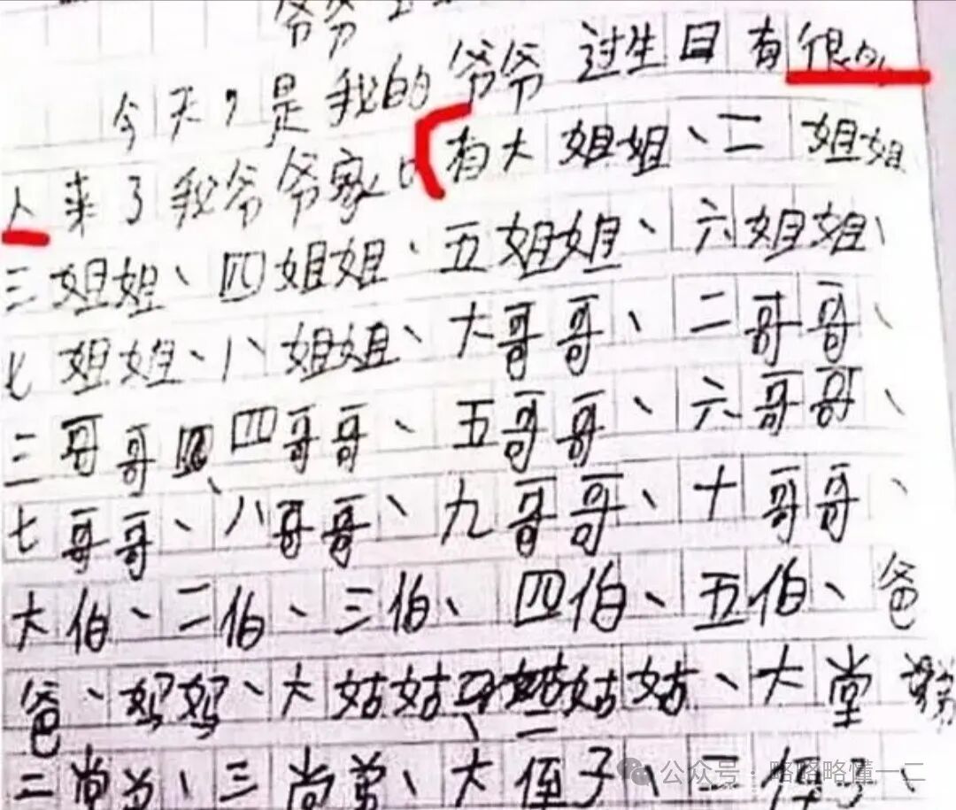 全文只写了爷爷过生日,家里的亲戚都来了哪些?估计小学生把所有自己知道的亲戚都写上了,也真是难为他了。