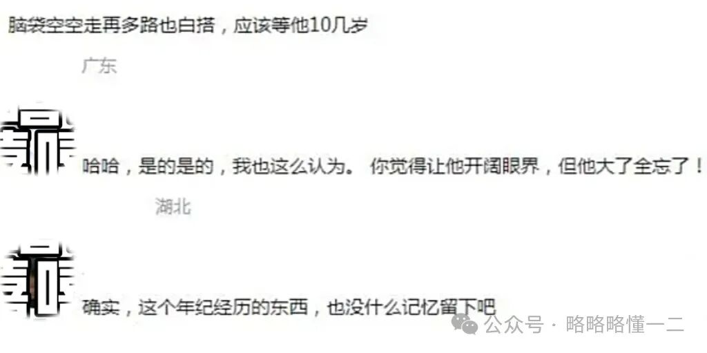 还有一部分网友觉得带孩子出去游学是好事,但孩子的年龄也应该考虑到,孩子年龄太小的话,出去游学可能意义不大。