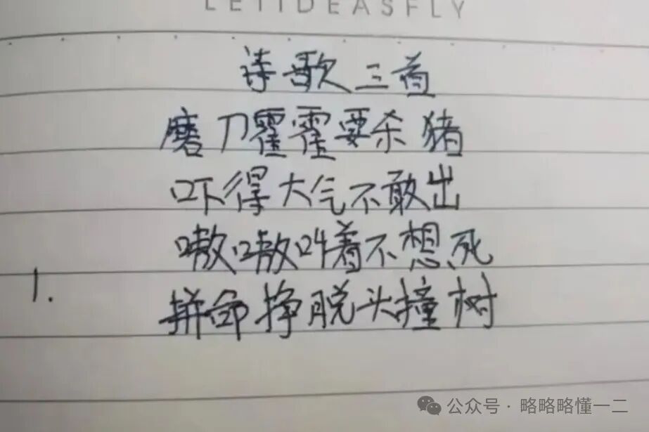 《木兰诗》中有一句时“磨刀霍霍向猪羊”,小学生改成“磨刀霍霍要杀猪,吓得大气不敢出。嗷嗷叫着不想死,拼命挣脱头撞树”。