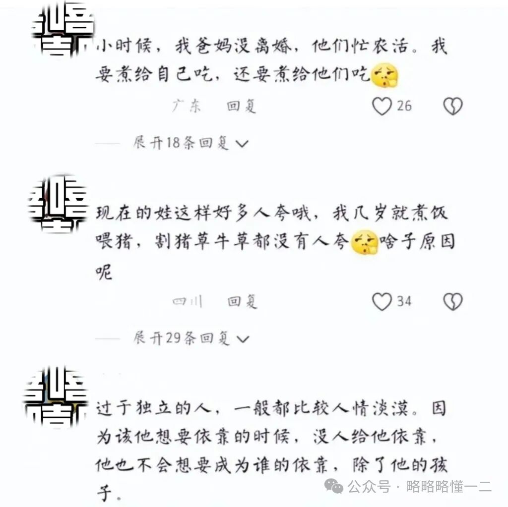 童年同样吃苦过来的人会觉得这没什么,自己几岁就会做饭、割草,不也是这么过来的。怎么没人夸自己?