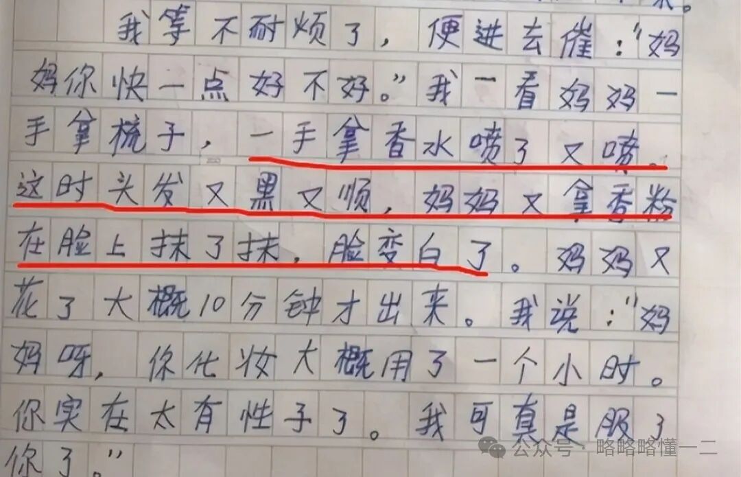 让小学生等的都有些不耐烦了,但对妈妈的动作描写,细节可以说是一个都没落下,比如妈妈一手拿梳子,一手拿香水,妈妈又拿香粉在脸上抹了抹,脸变白了。