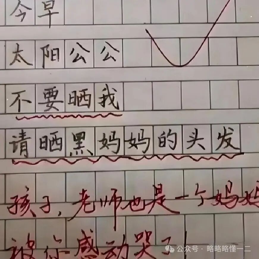 还有的同学一看就是和妈妈的感情很好,在作文当中写“太阳公公不要晒我,请晒黑妈妈的头发”。简单几句话,却让老师备受感动。