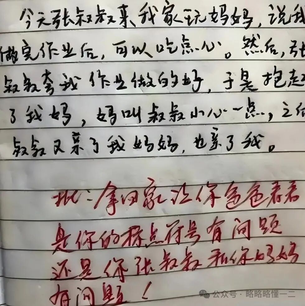 小学生这作文信息量太大了,什么“玩妈妈”、“张叔叔抱起了妈妈”、“叔叔亲了妈妈”等,这名同学到底知不知道自己在写什么?