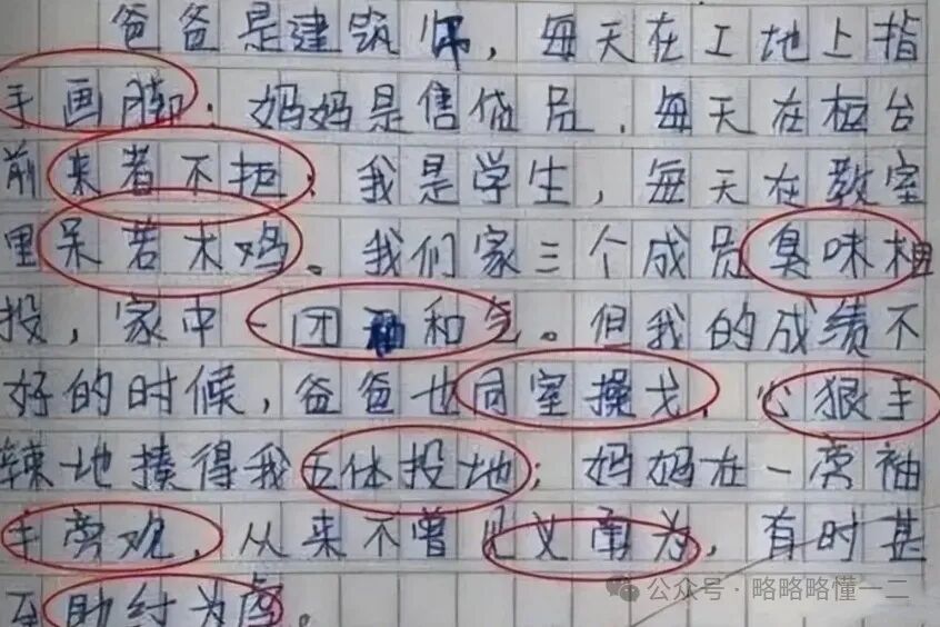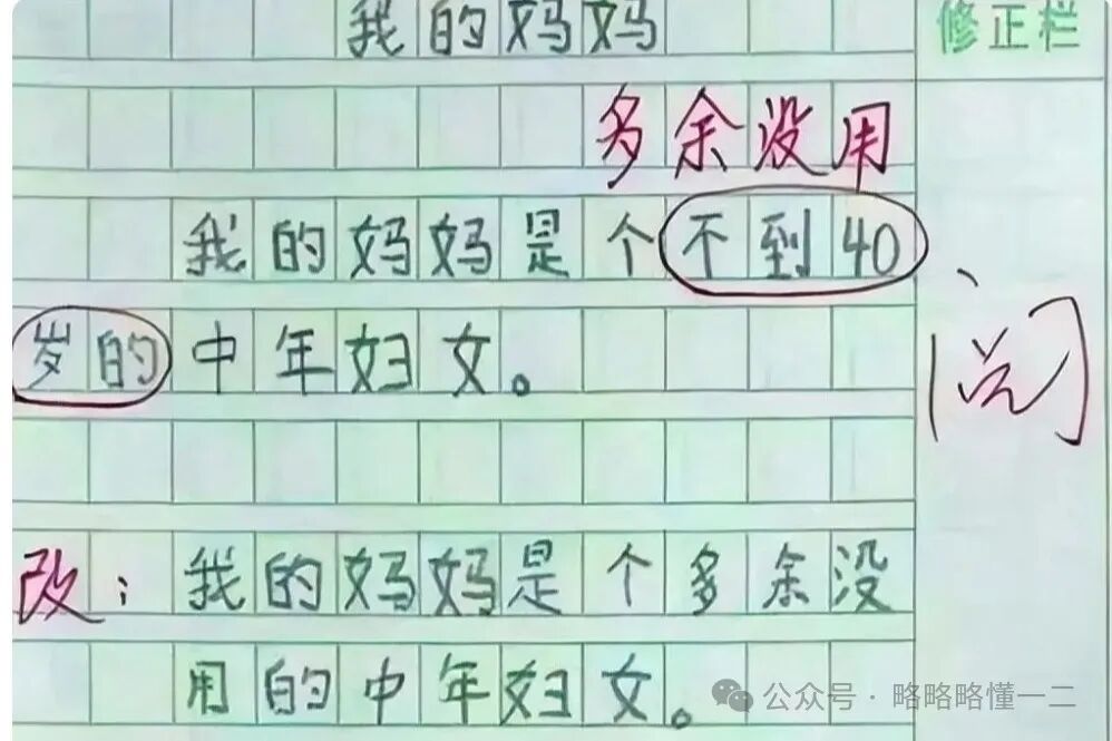 老师是说“不到40岁”和“中年”重复,结果小学生改成了:我的妈妈是个多余没用的中年妇女。
