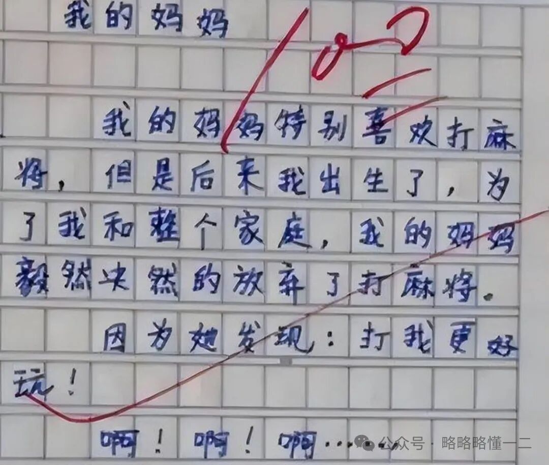 接下来这名同学的作文画风突变,写妈妈特别喜欢打麻将,但妈妈整体上来看还是非常顾家的,等到他出生之后,为了他和整个家庭,妈妈决定放弃打麻将,这么一看妈妈还是很有正事的。
