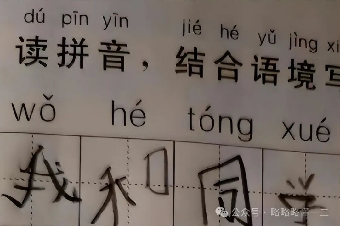 第一个看拼音写词语的题没毛病,写的是“我和同学”,也比较简单。第二题就有些离谱了,但题出的没问题,有问题的是“小孩哥”。