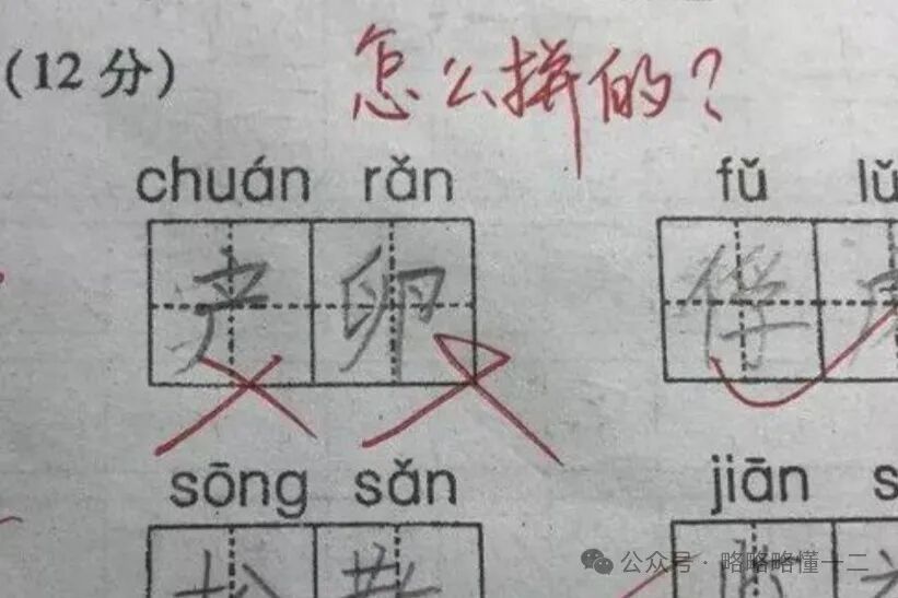 比如让写“传染”,他写的是“产卵”,老师在卷子上留言:怎么拼的?感觉小学生这道题是会的,就是马虎成分大了些。