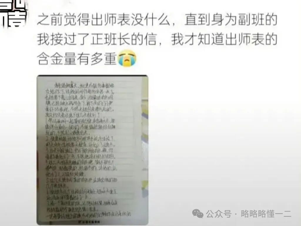 于是班长给副班长写了一封信,副班长表示:“之前觉得《出师表》没什么,直到身为副班长的我接过了正班长的信,才知道《出师表》含金量有多重?”